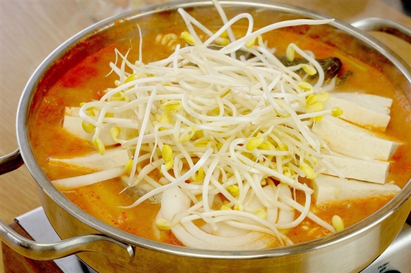 3 무와 두부는 2×3cm 크기, 0.5cm 두께로 썬다. 애호박은 0.5cm 두께로 반달 모양으로 썬다. 양파는 0.5cm 폭으로 썰고 고추, 대파는 어슷 썬다. 콩나물과 쑥갓은 흐르는 물에 씻은 후 체에 밭쳐 물기를 뺀다
