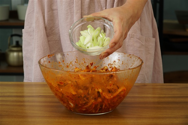 무친 후 어슷썰기 한 대파를 버무려 주시면