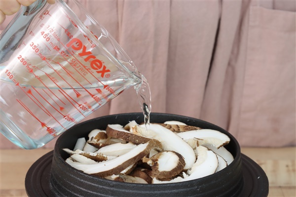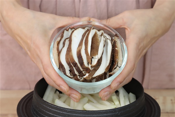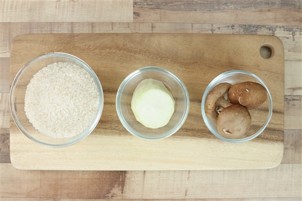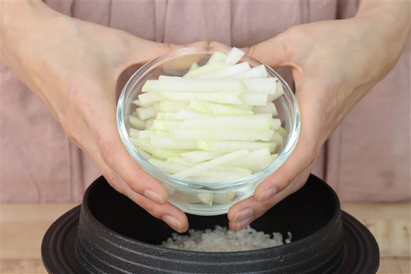 3. 쌀 위에 채썬 무, 표고버섯을 올리고