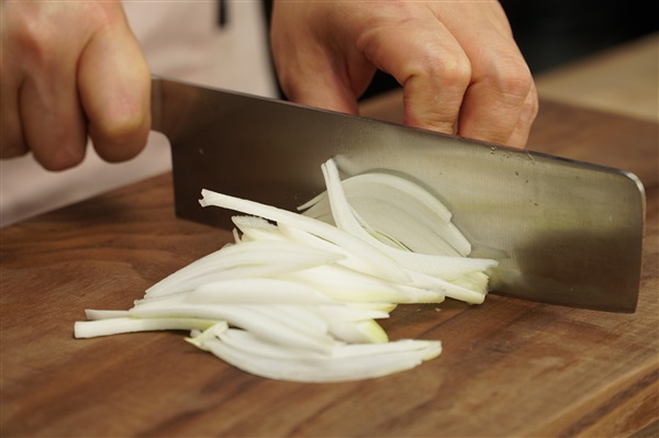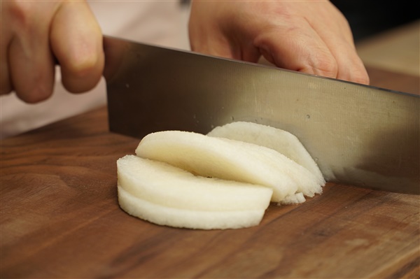 어슷 썰고, 배는 껍질을 벗겨 납작하게, 양파는 채를