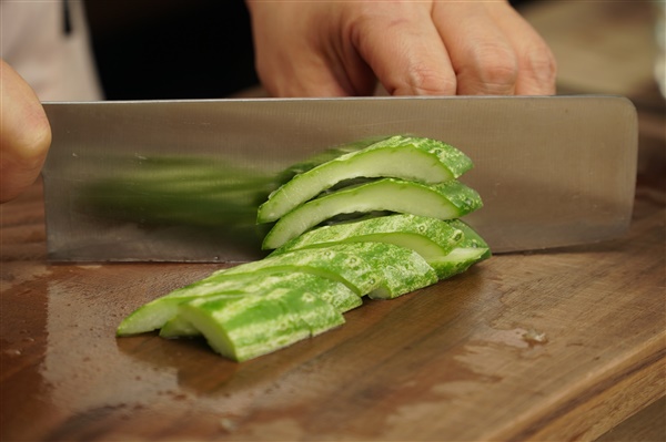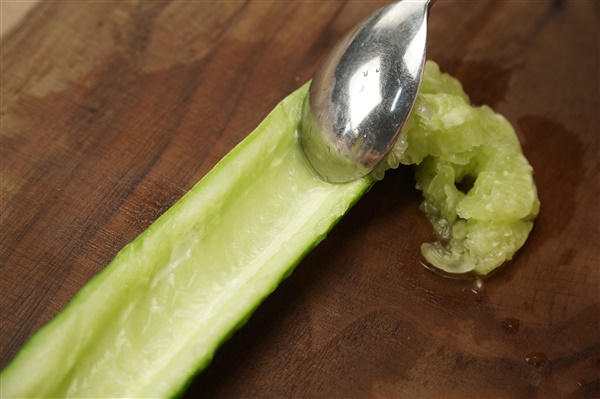 2. 오이는 길게 반으로 갈라 숟가락으로 씨를 긁어낸 뒤