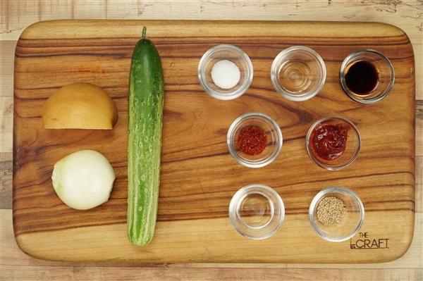 오이 1개, 배 1/6개, 양파 1/4개, 소금 약간